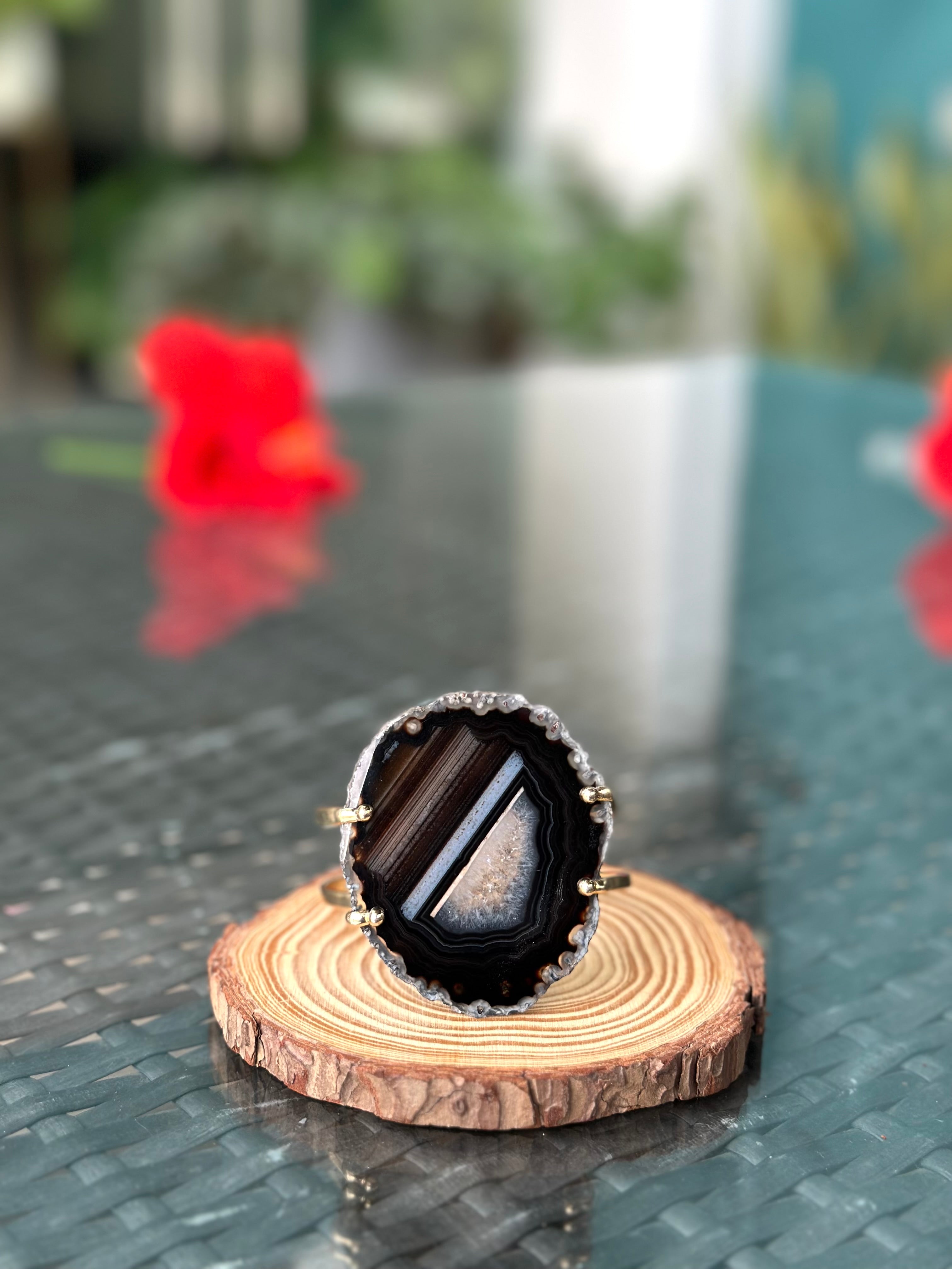 This bracelet features a stunning black agate stone, radiating with layered tones of vibrant shades of black , framed in a soft gold setting. Its vivid, nature-inspired palette captures a sense of energy and balance, making it both eye-catching and effortlessly elegant.