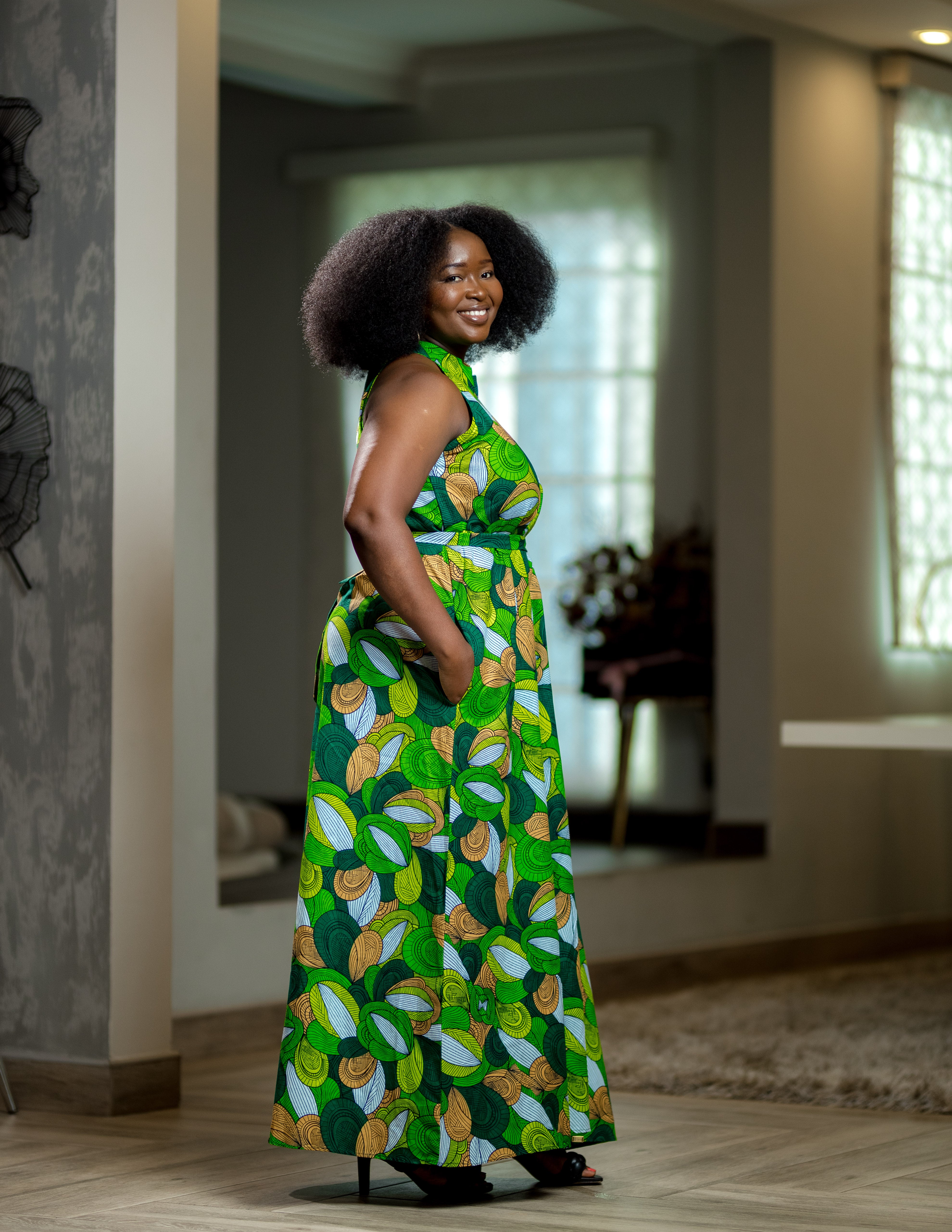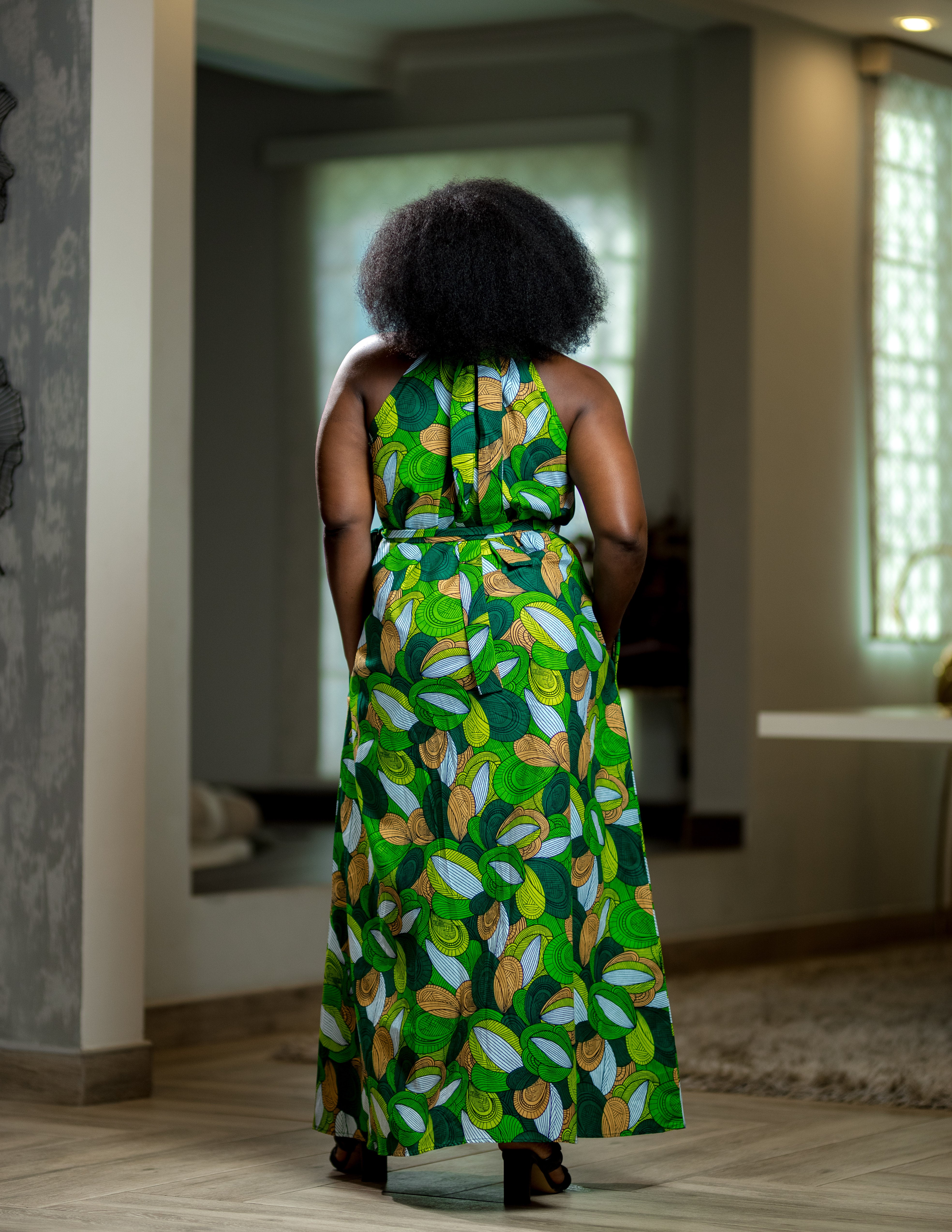 Make a sophisticated statement in our striking Green Maxi Dress, featuring bold African-inspired patterns in vivid green, orange and white. A refined high neckline, and an elegant cutout detail that adds a modern touch. Its flowing ensures comfortable, graceful movement, making it perfect for formal gatherings, weddings, or elegant evening occasions. Designed to blend contemporary style with cultural sophistication, this dress is a standout addition to your wardrobe.