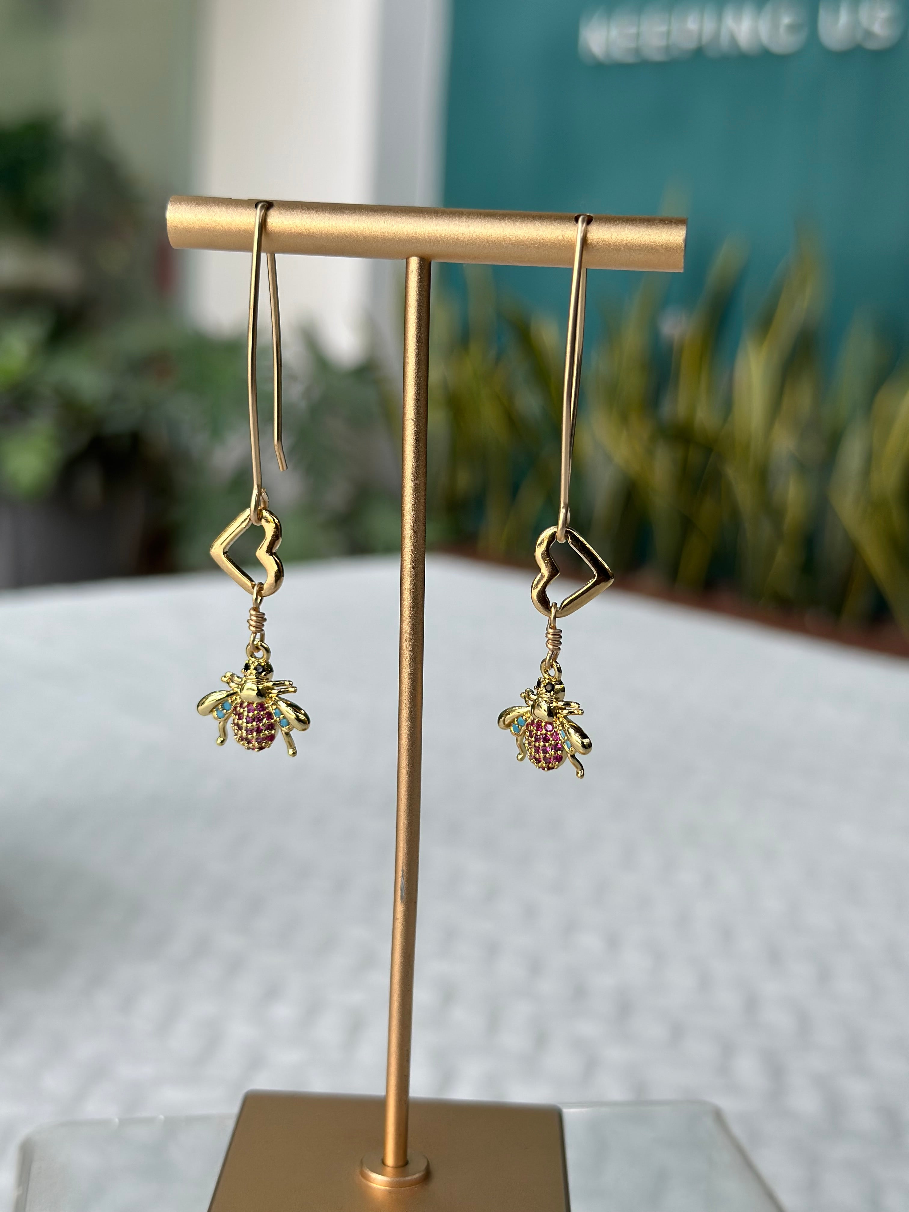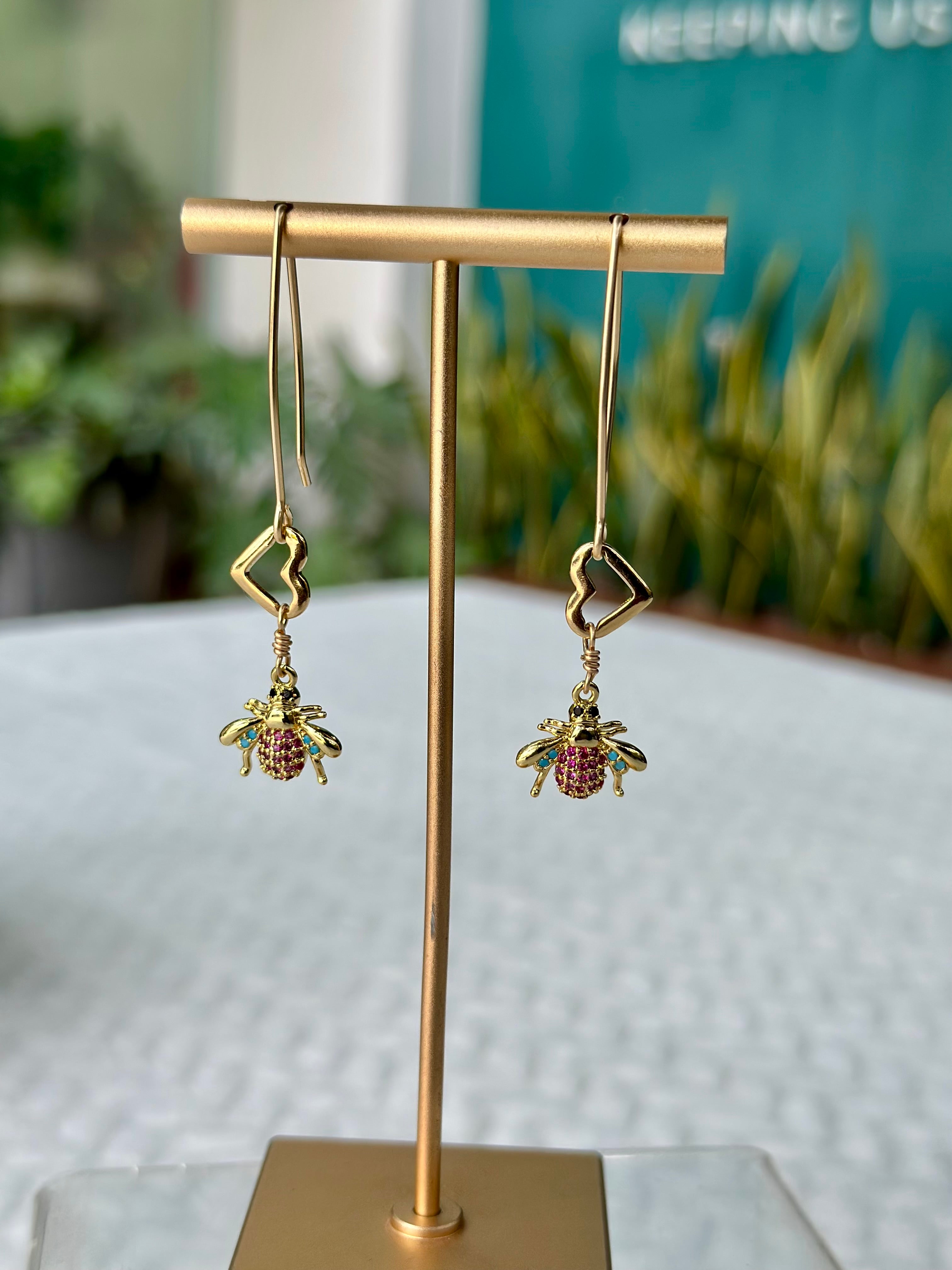 A celebration of nature’s finest details, these dangling bee earrings are finished in gold and subtly adorned with delicate pink crystals on the back for a touch of unexpected sparkle. Lightweight and beautifully balanced, they blend playful charm with refined elegance, making them a timeless statement piece.