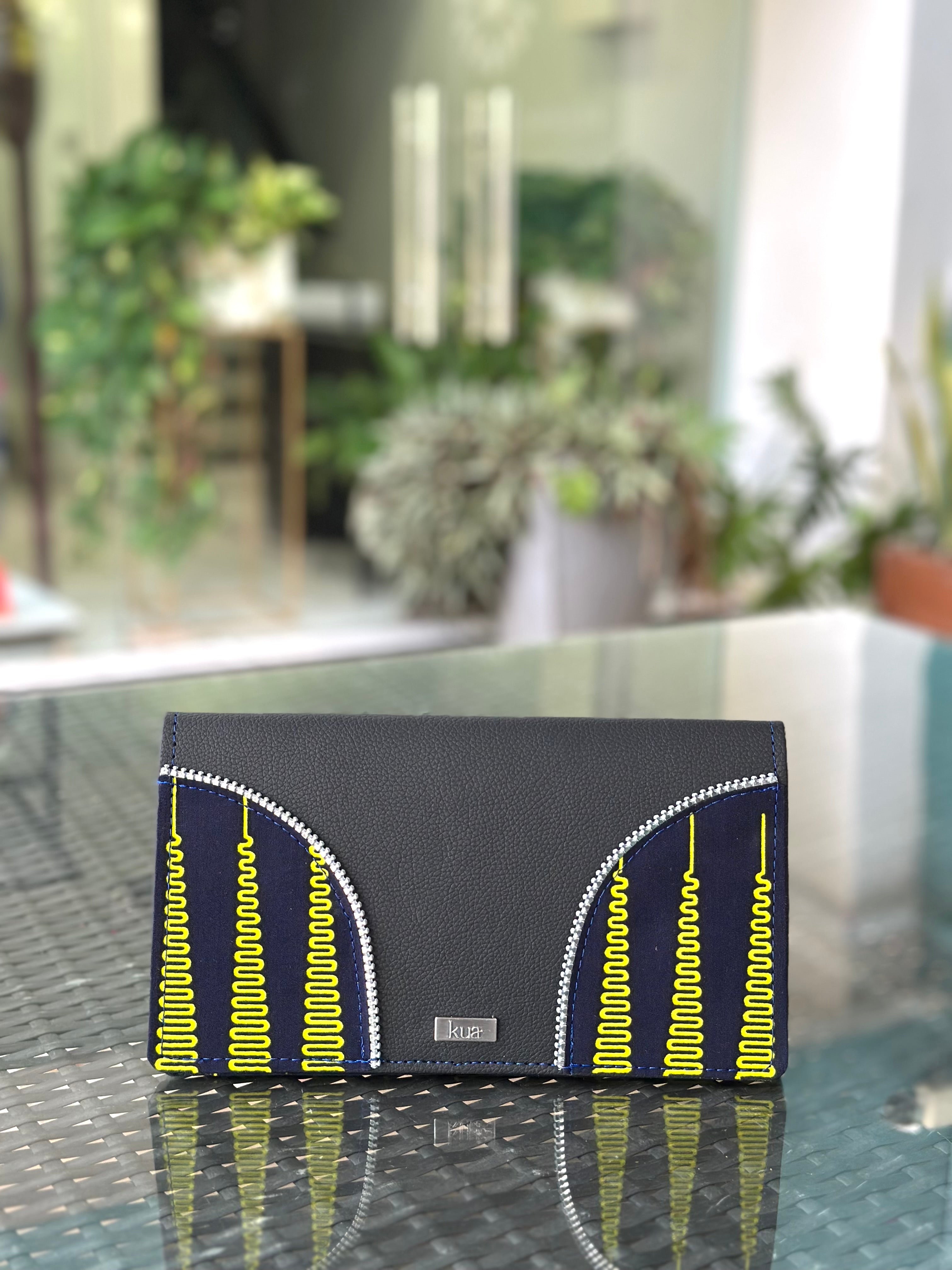 Make a fearless fashion statement with this eye-catching black clutch, designed to steal the spotlight. The curved panels with vibrant yellow and blue, beautifully framed with silver touch of glam. This piece effortlessly fuses tradition with modern edge. Whether it’s a wedding, cocktail event, or dinner date, this clutch is your go-to for confident elegance.