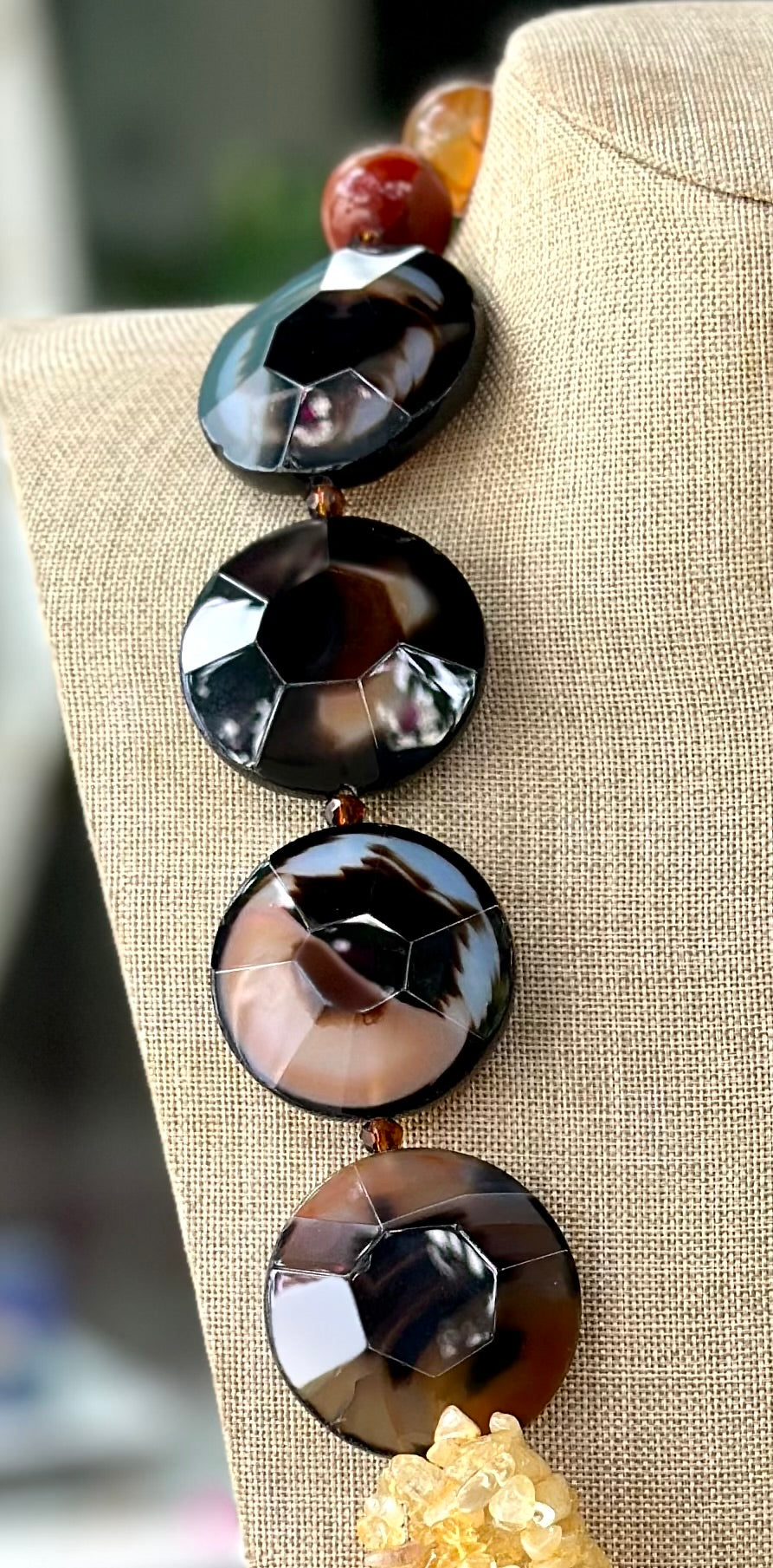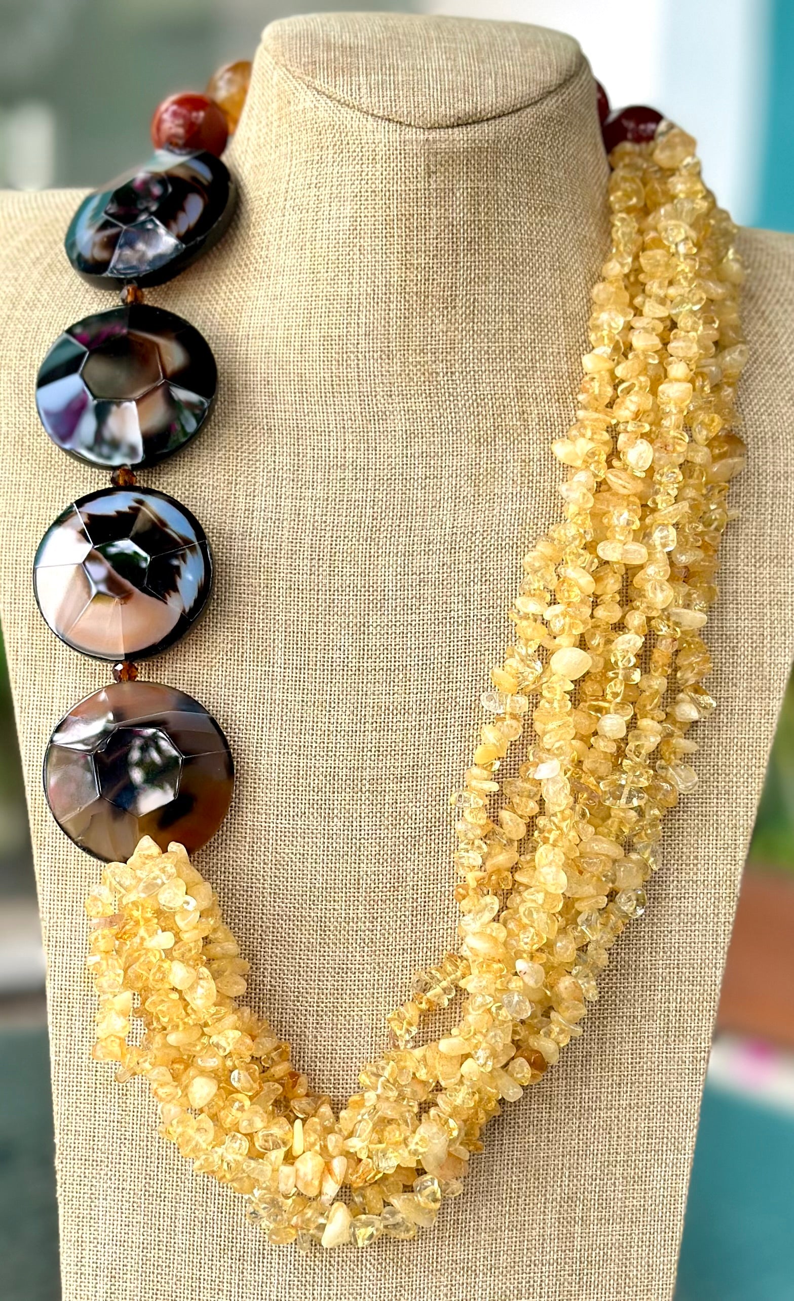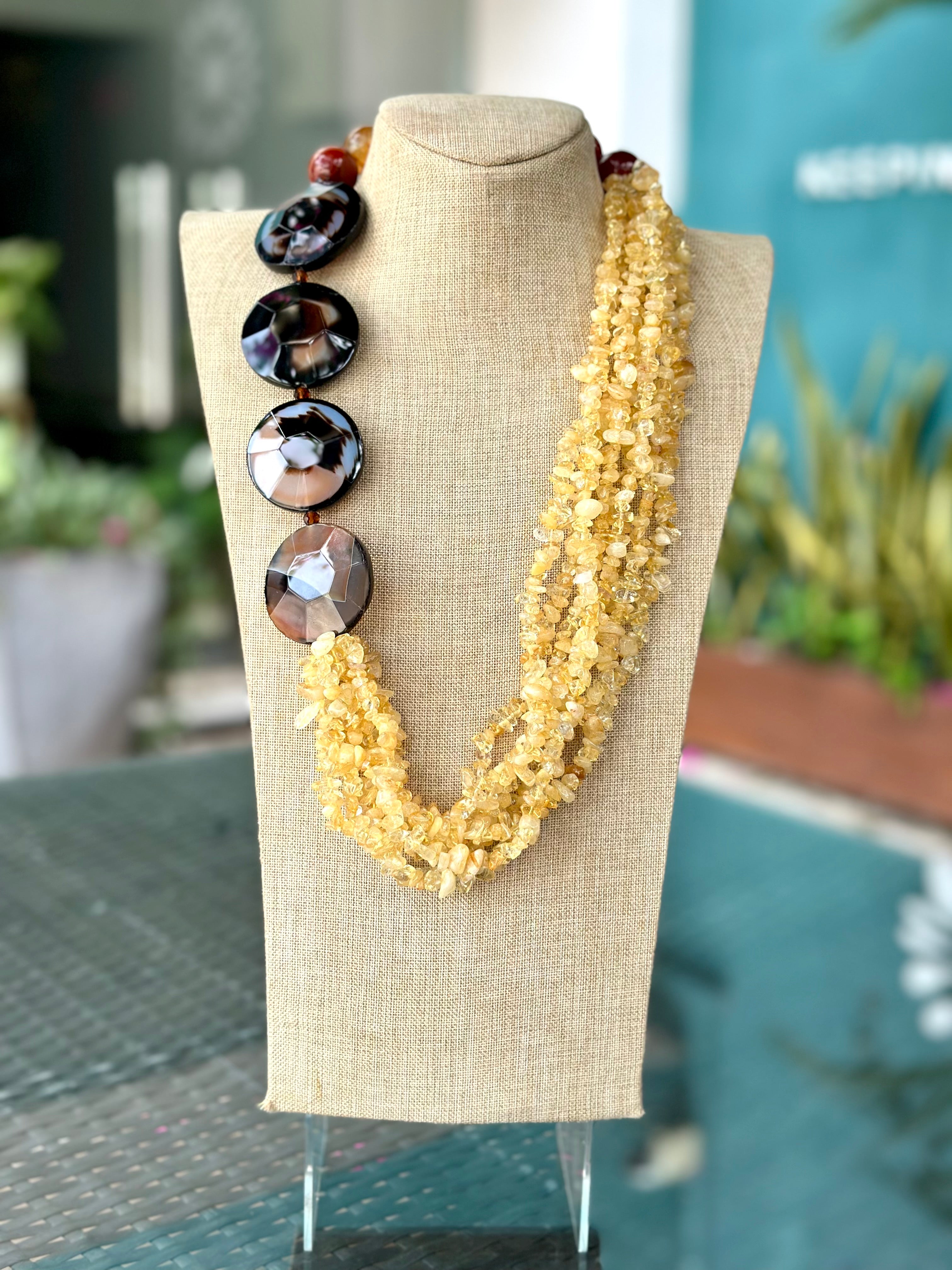 On one side, 4 large, polished yellow stones draw inspiration from nature’s raw beauty, each uniquely shaped and full of character. On the other, dozens of vibrant gold bead strands cascade in rich layers, creating a dramatic contrast that’s both elegant and empowering.