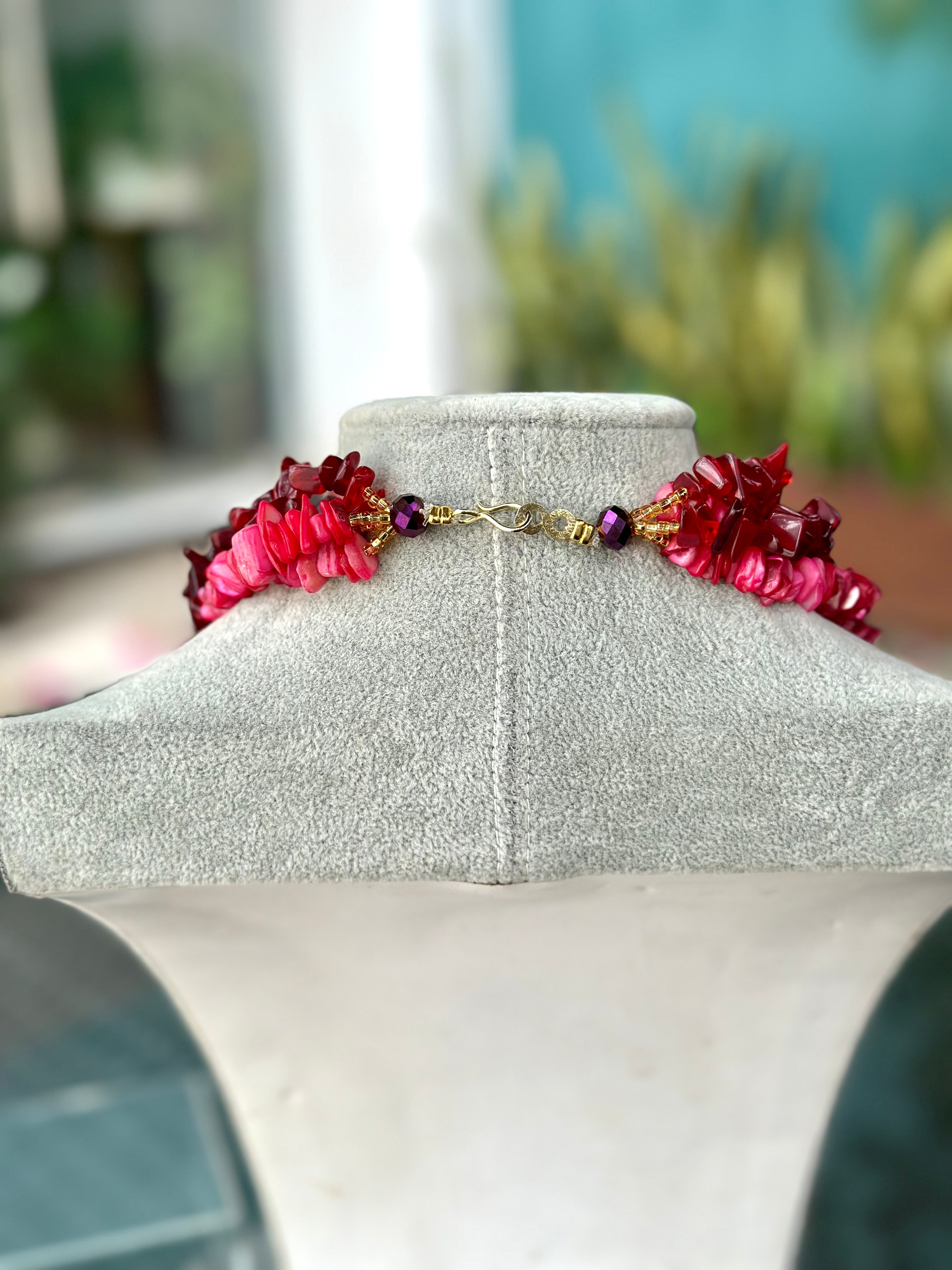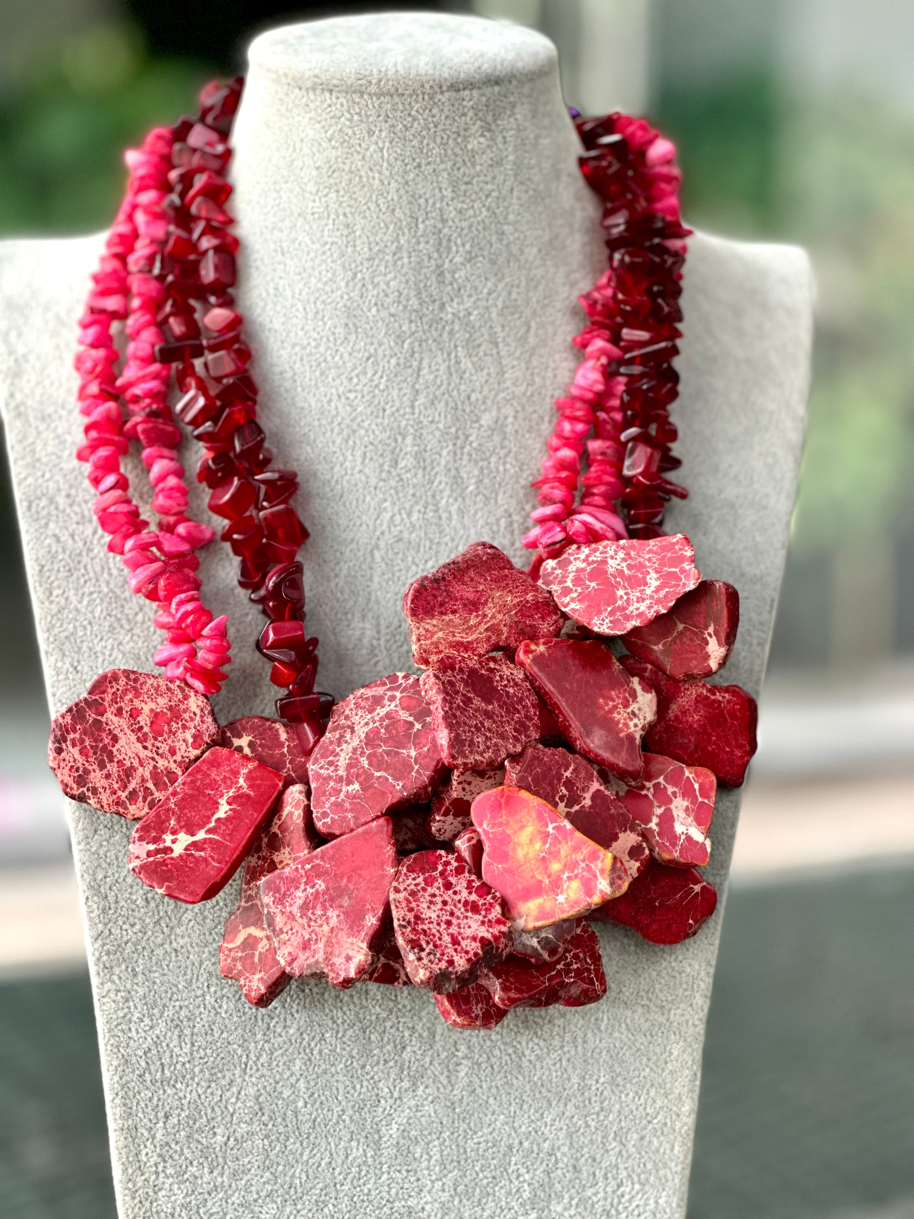 This necklace is made with large, flat, irregularly shaped beads, arranged in a graduated pattern for visual impact. The beads are polished and faceted, enhancing their textured and natural appearance. This statement necklace has a prominent, symmetrical arrangement giving it a balanced and striking look.